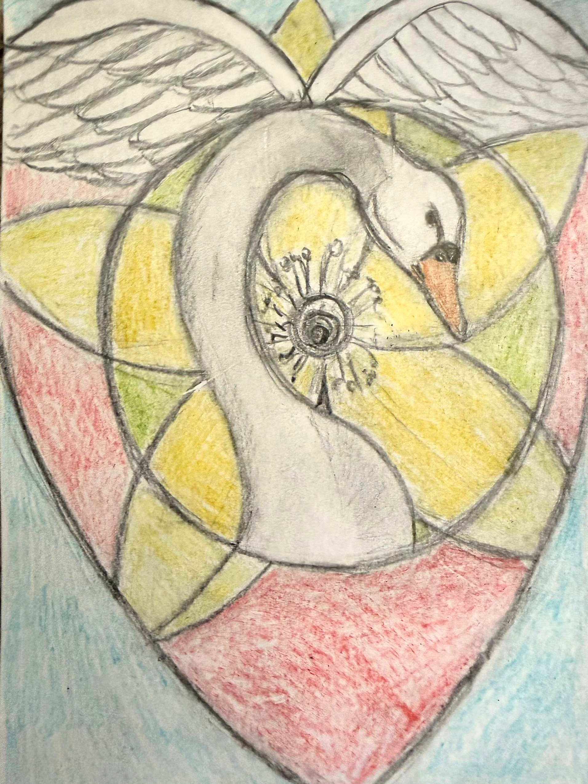 Ik laat je een voorbeeld zien, zoals een hart waarin de bogen veranderen in vleugels van een zwaan, met de gouden gloed van sint-janskruid. Zo ontstaat een bijna mythisch beeld dat jouw innerlijke boodschap uit de oertijd zichtbaar maakt.